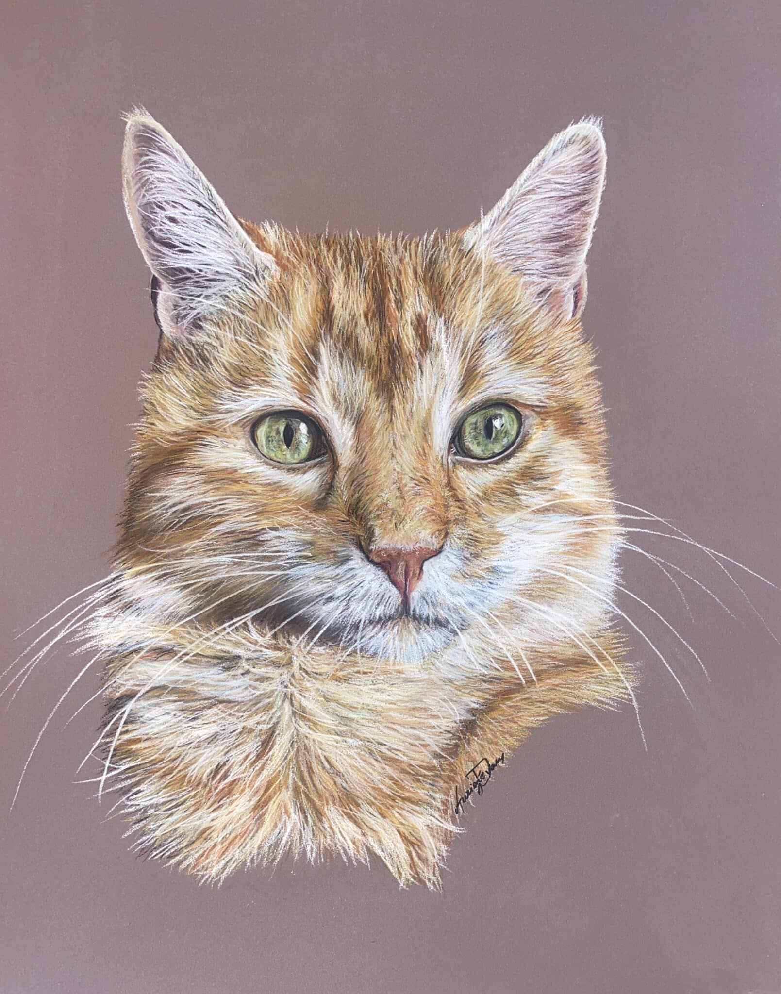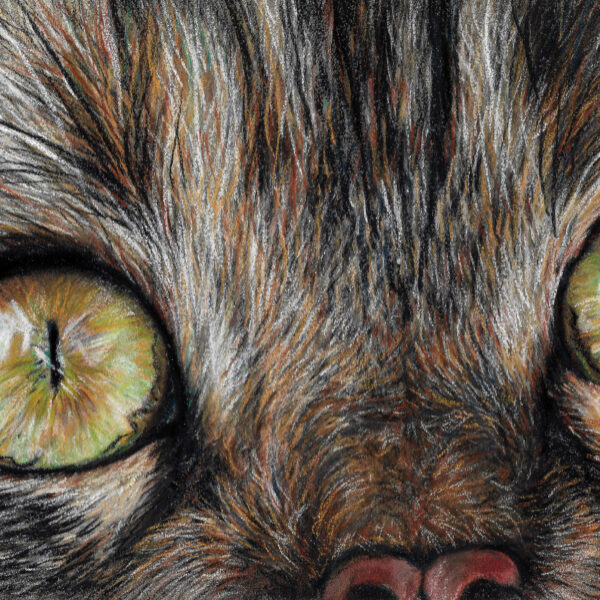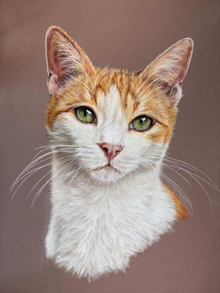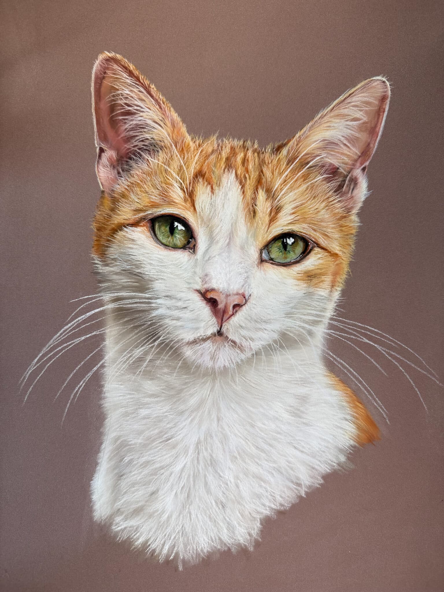 Portrait animalier de chat personnalisé au pastel sec. Œuvre unique, faite main, capturant l’expression et la douceur de votre félin. Commande sur mesure, 100 % personnalisable.